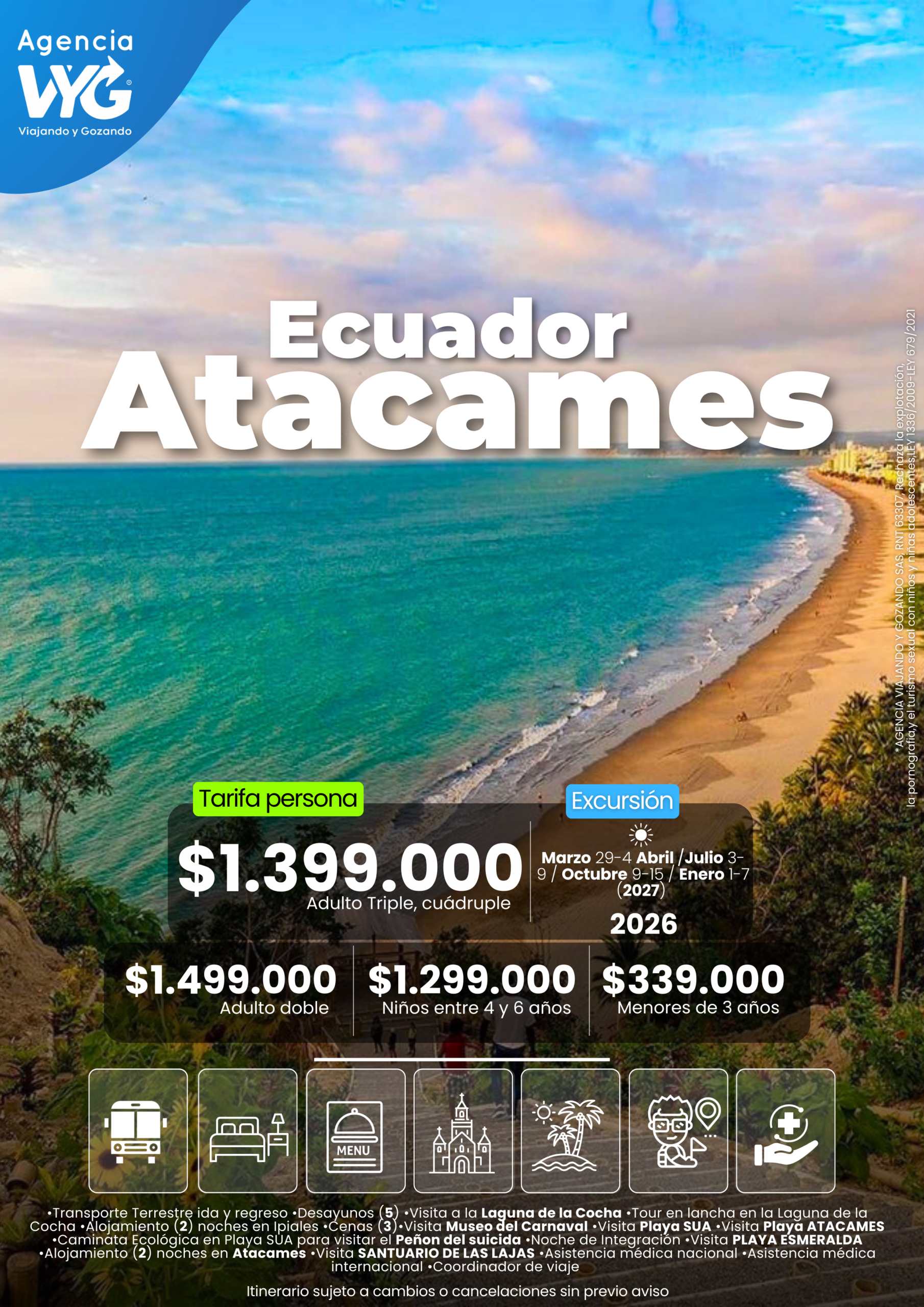 - Las condiciones climáticas o casos de fuerza mayor pueden afectar el cumplimiento a cabalidad del itinerario (Nos sujetamos a las indicaciones de la DIMAR, capitanía de puerto)