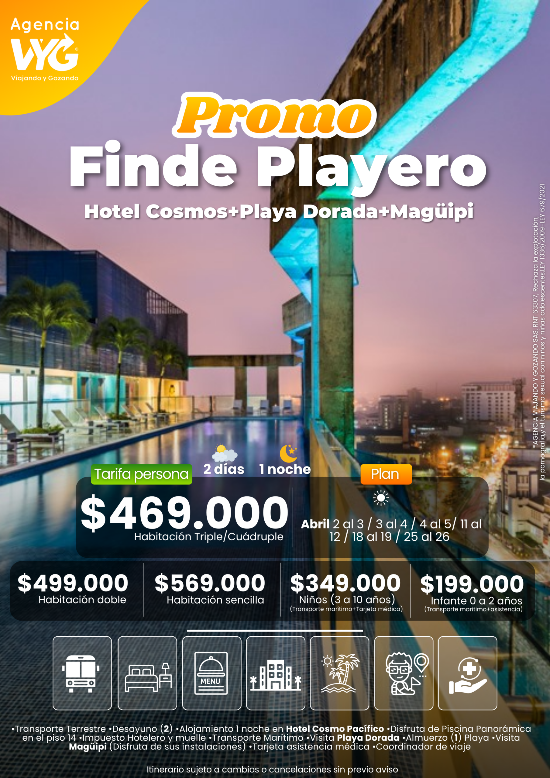 - Las condiciones climáticas o casos de fuerza mayor pueden afectar el cumplimiento a cabalidad del itinerario (Nos sujetamos a las indicaciones de la DIMAR, capitanía de puerto)